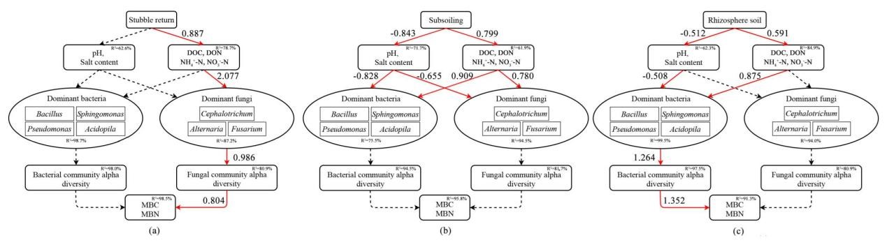 根据SEM分析,秸秆还田主要通过显著增加可溶性碳氮组分增加优势真菌属的丰度和α多样性,进而提高真菌对碳氮的固持。深松虽然没有影响微生物对碳氮的固持,但是通过pH和含盐量的降低以及可溶性碳氮组分的增加提高了细菌和真菌优势菌属的丰度。与非根际土相比,根际土壤主要通过pH和含盐量的降低以及可溶性碳氮组分的增加提高了优势细菌属的丰度及其多样性,最终提高了细菌对碳氮的固持。