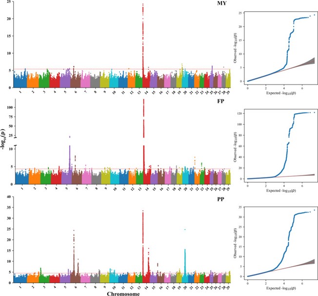 图1. 产奶量、乳脂率和乳蛋白率纵向全基因组关联分析的曼哈顿图和QQ图
