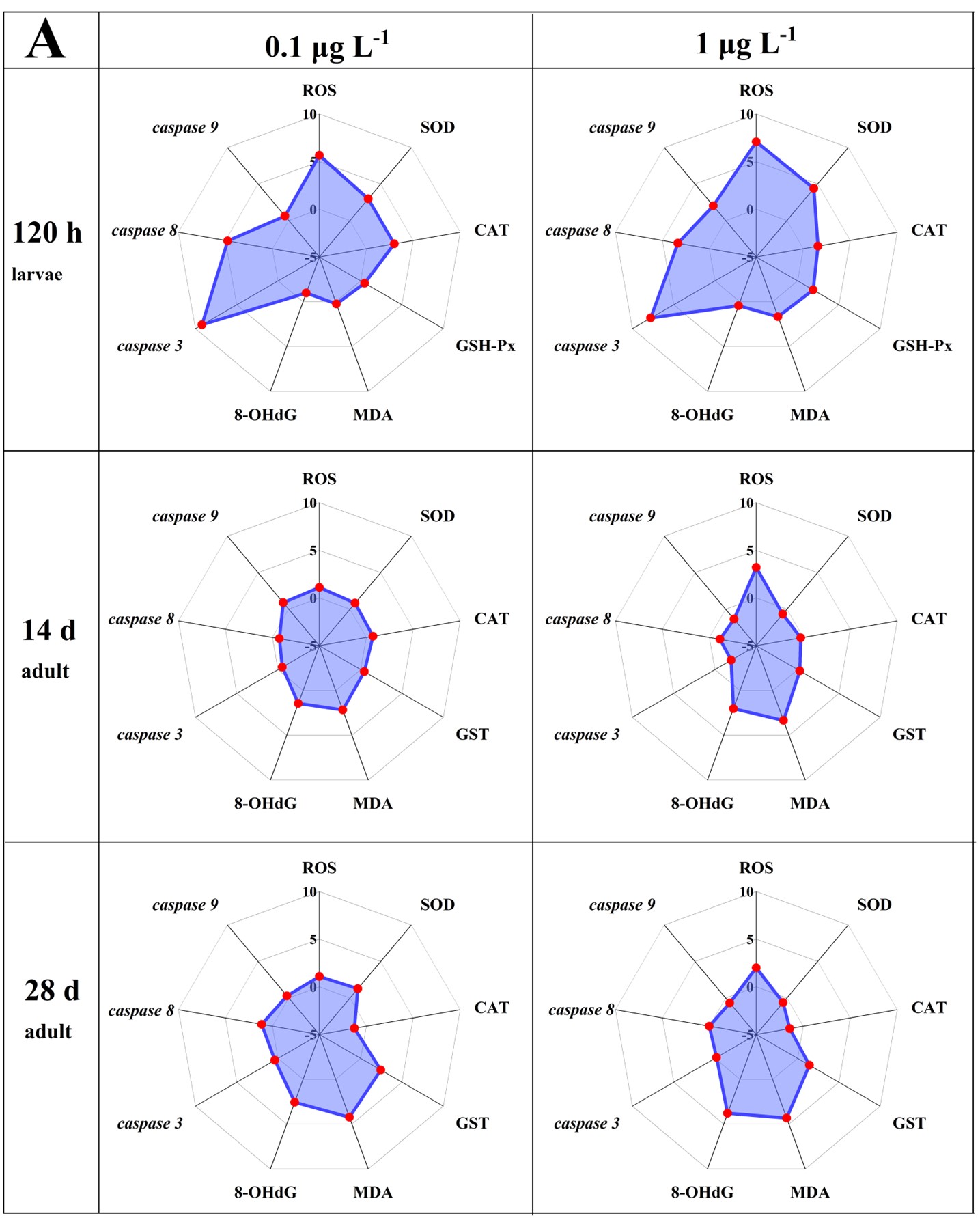 通过计算综合生物标志物响应指数得出,caspase 3基因和脂质过氧化产物丙二醛可分别作为双氟磺草胺对斑马鱼幼鱼和成鱼影响的早期预警指标。双氟磺草胺的暴露浓度越高,其对斑马鱼幼鱼和成鱼的毒性越大。暴露时间越久,其对成鱼的毒性越高。研究发现了双氟磺草胺对斑马鱼幼鱼和成鱼的毒性不同,在未来研究双氟磺草胺对斑马鱼的毒性时,需要对不同生命阶段(幼鱼和成鱼)进行研究。