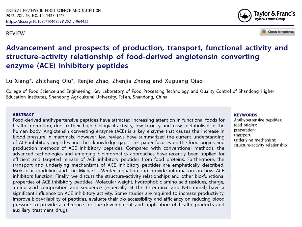 近日,山东农业大学食品科学与工程学院乔旭光教授研究团队在Critical Reviews in Food Science and Nutrition发表了题为“Advancement and prospects of production, transport, functional activity and structure-activity relationship of food-derived angiotensin converting enzyme (ACE) inhibitory peptides”的论文,系统阐述了ACE抑制肽的来源、制备方法、体内转运以及潜在机制的最新研究进展,此外还对目前ACE抑制肽在食品开发和利用中存在的局限以及解决措施进行了总结,为保健品和辅助治疗药物的开发和应用提供参考。博士研究生项璐和邱志常博士为共同第一作者,乔旭光教授和郑振佳副教授为本文的共同通讯作者。