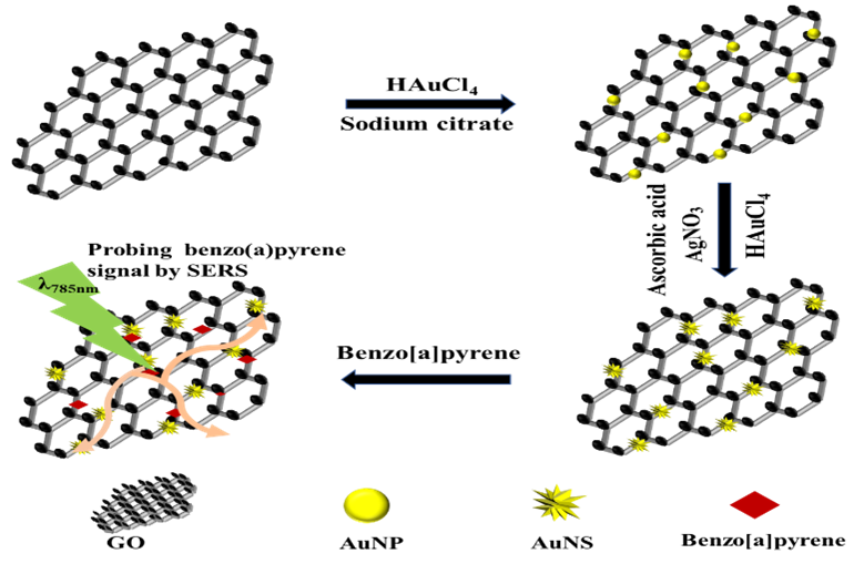 还原氧化石墨烯具有类似于石墨烯的性质,包括极高的比表面积,丰富的多芳烃结构域和出色的吸附能力,在SERS领域是一种非常有应用前景的基底材料。通过π-π堆积与疏水相互作用,还原氧化石墨烯可以作为芳香族分子的捕获平台,金纳米星具有丰富的尖锐树枝状纳米结构,可以产生强烈的SERS“热点”效应。苯并[a]芘等芳香族分子中缺少亲和金属的官能团,对Au和Ag等贵金属表现出非常差的亲和力。通过种子介导生长法在还原氧化石墨烯表面合成金纳米星,通过还原氧化石墨烯的吸附作用使苯并[a]芘分子接近金纳米星表面,借助金纳米星的表面等离子体共振效应获得增强的苯并[a]芘SERS信号。