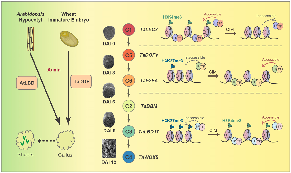 植物的基因功能研究和性状改良都依赖遗传转化,而小麦遗传转化比较困难,特别是在生产上推广的品种转化效率较低。为了更好地理解小麦的再生过程,探究其中的分子机制,以及挖掘提高小麦转化效率的新基因,研究团队通过多组学联合分析的方式绘制了小麦再生过程的转录及表观修饰动态图谱,构建了小麦再生的转录调控网络,鉴定出2个能显著提高小麦遗传转化效率的新基因。