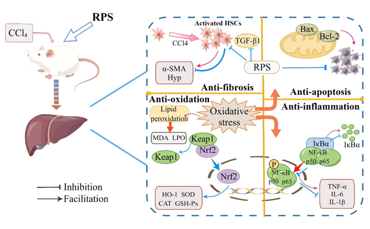 我们基于体内构建慢性肝损伤小鼠模型探索了RPS对肝损伤的修复机制。结果表明,RPS能够协同调节Nrf2、NF-κB、Bcl-2/Bax等通路,改善机体的氧化应激水平,抑制炎症因子的过度释放,抑制多种纤维化因子的高表达,通过发挥抗氧化、抗炎、抗凋亡和抗纤维化等作用,显示出较好的抗慢性肝损伤的作用。该研究为天然保肝药物的开发,以及促进我国食用菌产业的进一步发展提供了一定的参考意义。