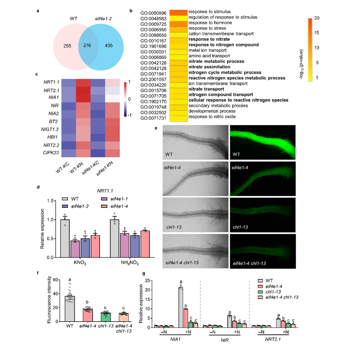 该研究通过正向遗传学筛选到一个对硝酸盐响应有缺陷的突变体Mut36,图位克隆分析发现,Mut36突变体表型是由At4g18040基因的第二个外显子上发生点突变(G to A)所致,该基因编码翻译起始因子eIF4E1。