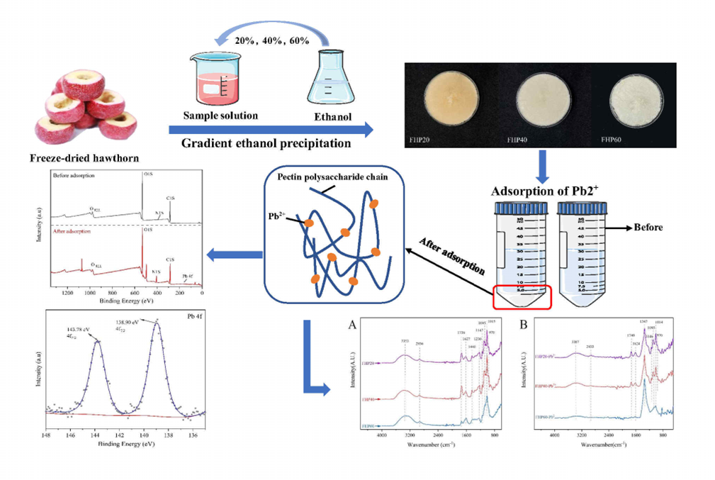成果二:在期刊《International Journal of Biological Macromolecules》发表题为“Physicochemical properties and Pb2+adsorption capacity of freeze-dried hawthorn pectin fractions by gradient ethanol precipitation”的研究论文。朱传合教授为通讯作者,研究生李智信为论文的第一作者。