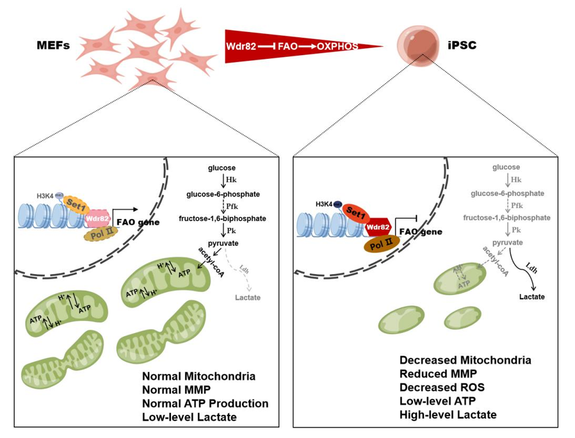 图2. Wdr82抑制细胞氧化磷酸化过程、促进体细胞重编程的工作模式图