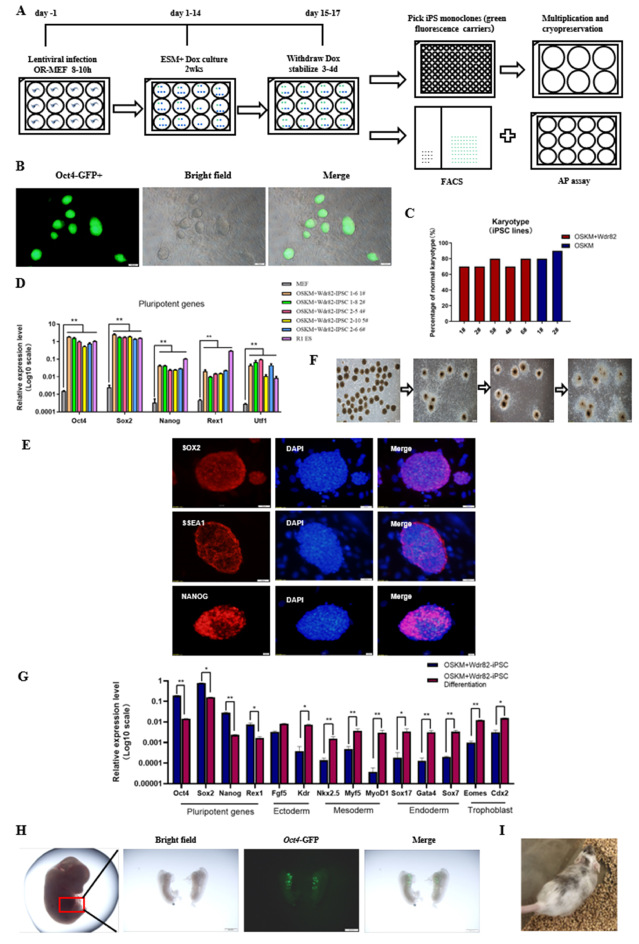 图1. 体细胞重编程形成的Wdr82+OSKM-iPSC克隆具有干细胞功能,可产生嵌合体小鼠