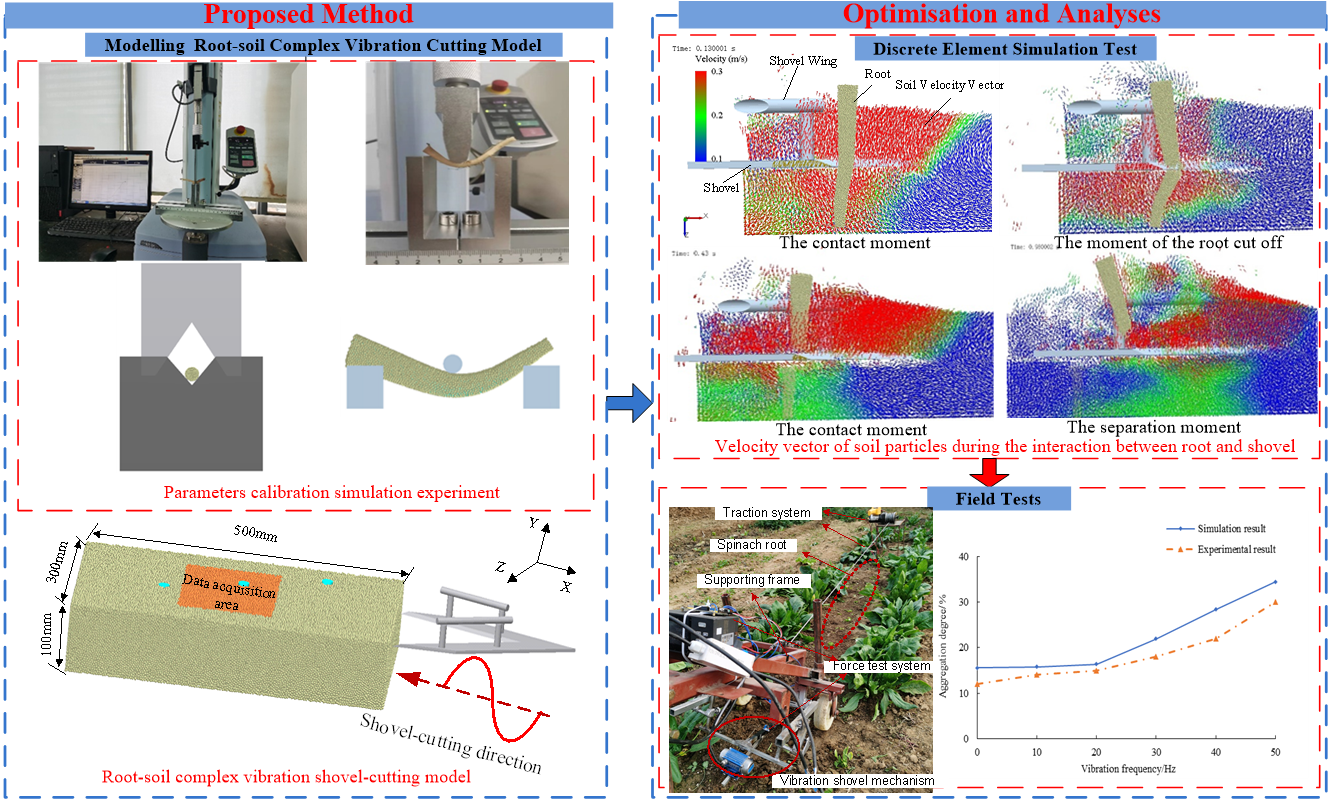 为了明晰根土复合铲切机理,课题组建立了根土铲振动铲切力学模型,采用Hertz-Mindlin with Bonding模型分析了土壤颗粒间的粘结作用,明确了土壤破碎的边界条件,并采用振动铲切的形式来加速土壤的破碎。根-土壤-铲刀之间的相互作用是研究破土铲根过程的核心问题,采用了离散元方法对根土铲切过程进行了微观分析。分别建立了土壤、根和根土接触模型,并对相应模型进行了参数标定,在此基础上建立了根土复合振动铲切模型,对振动铲切过程进行了研究。对根土复合振动铲切过程进行了仿真分析,研究了振动铲切参数作业效果的影响规律。以铲切速度、振动频率、振动幅度作为试验因素,开展三因素三水平正交旋转组合优化试验,最终确定了最优铲切工作参数。通过对根土复合铲切过程进行微观分析可以探究铲切机理,为菠菜机械化设计提供了合理的依据。