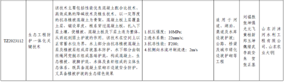 山东农业大学联合山东沂沭河水利工程有限公司开展校企合作,在沂沭河流域开展科研合作与工程推广应用,建立生态护坡工程项目多处,累计推广面积5万余平方米。该技术获得国家发明专利2项,获淮委科学技术奖,第二届生态混凝土创新设计应用大赛二等奖,其主要性能指标有:抗压强度10MPa,透水系数22mm/s,抗冻性能F200,抗侧向水流冲刷流速2m/s。