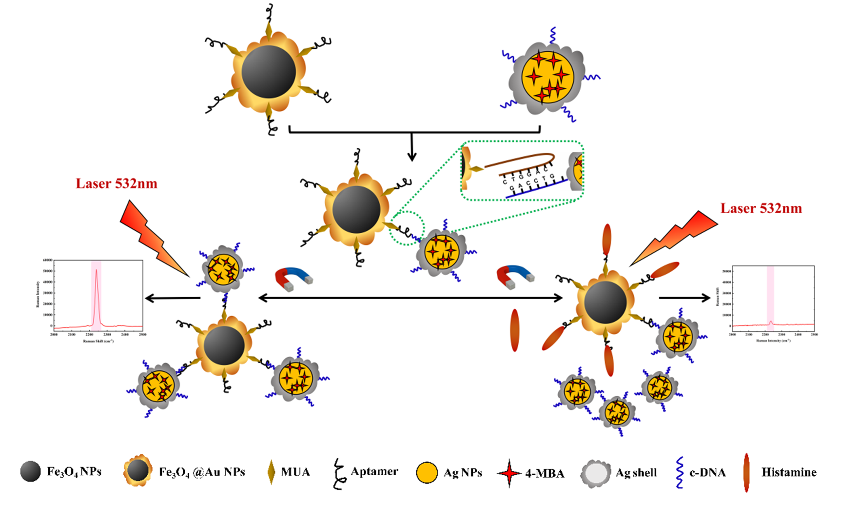 基于以上讨论,研究团队构建了一种“核-卫星”型“生物静默区”表面增强拉曼光谱(SERS)适配体传感器,其中,组胺适配体修饰的磁性Fe3O4@Au NPs作为组胺识别探针,c-DNA修饰的“生物静默区”SERS标签(Ag@4-MBN@Ag)作为SERS信号探针。该传感器基于核酸适配体特异性识别辅助磁诱导增敏技术实现了食品中组胺的超灵敏、快速、无干扰的检测,方法检出限低至0.65×10-3 ng mL-1。研究结果对“生物静默区”无干扰SERS技术在食品危害因子检测中的应用提供了新思路。