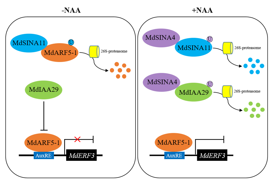 该项研究发现,ARF转录因子MdARF5-1是苹果花青素生物合成的负调控因子,而ERF转录因子MdERF3是花青素生物合成的正调控因子。MdARF5-1通过转录抑制MdERF3的表达来整合生长素和乙烯信号。生长素信号通路阻遏蛋白MdIAA29缓解MdARF5-1对MdERF3的转录抑制,从而降低MdARF5-1对花青素生物合成的抑制作用。研究团队还发现,SINA E3泛素连接酶MdSINA4和MdSINA11通过分别靶向MdIAA29和MdARF5-1的泛素化降解,在花青素生物合成中发挥负向和正向调控作用。MdSINA4还可使MdSINA11去稳定,以响应生长素信号转导调节花青素积累。MdIAA29–MdARF5-1–MdERF3级联调节模块和MdSINA4-MdSINA11泛素化调节模块在整合生长素和乙烯信号以及调控生长素信号转导的泛素化修饰中发挥重要作用。