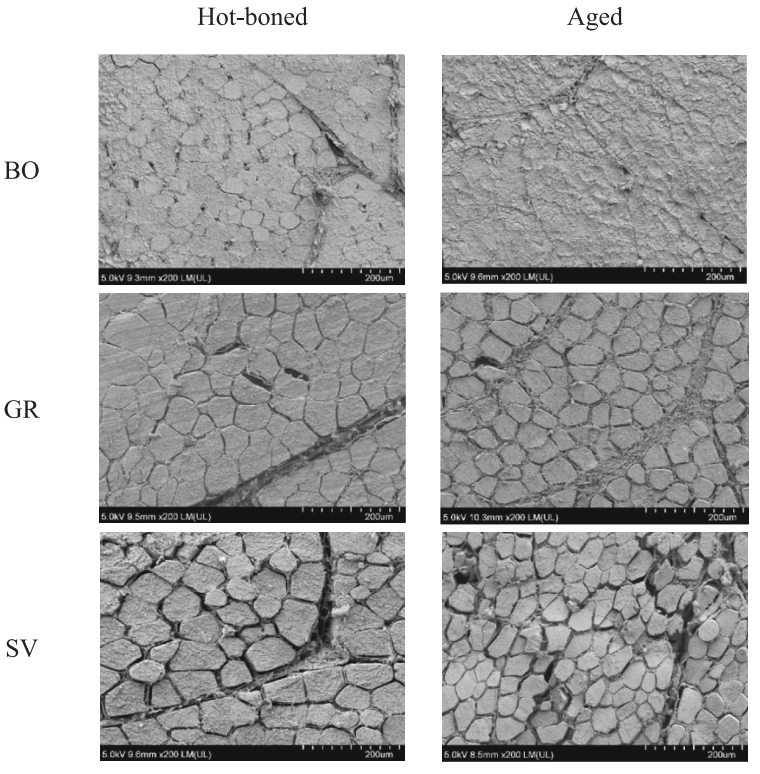 图1 不同熟制方式和肌肉状态的半膜肌牛排的扫描电子显微镜图像