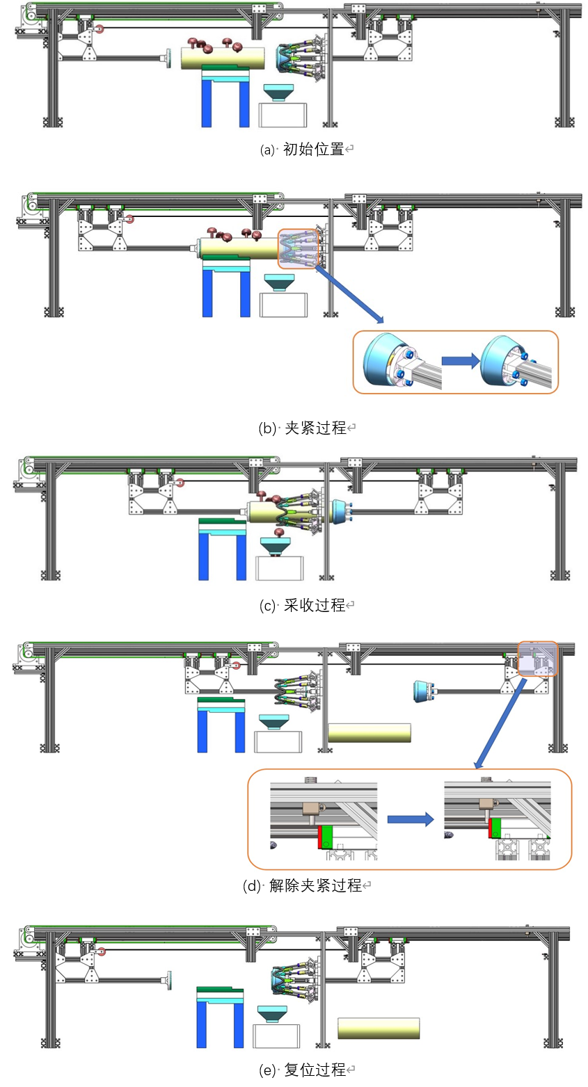 针对香菇生长密集、采摘易损伤、高速采摘等需求,该研究首创了香菇机械化采摘新模式,并创新设计了一种新型的香菇采收末端执行器(图1),实现低损伤、高效采摘。通过采摘过程动态过程(图2)的力学分析和有限元分析,明确了采收过程中末端执行器部件-香菇-菌棒的分离机理,优化了末端执行器的结构设计和作业参数,对提升采摘性能具有重要的理论指导作用。