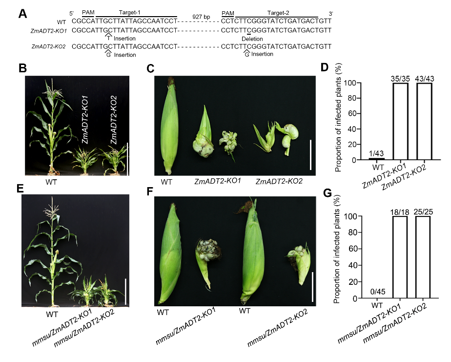 该研究鉴定到了一个由单基因突变而同时具有矮化和极易感玉米瘤黑粉病的玉米突变体(Maize mutant highly susceptible to U. maydis,mmsu)。通过图位克隆及等位杂交实验证明了是由一个编码arogenate dehydratase/prephenate dehydratase (ADT/PDT) 的基因突变所导致的上述表型,将其命名为ZmADT2。ZmADT2蛋白定位于叶绿体,其基因突变影响了玉米叶绿体超微结构和光合作用。进一步通过转录组和代谢组结合分析挖掘了玉米响应瘤黑粉菌侵染的多个代谢途径。综上所述,该研究证明了ZmADT2是维持玉米代谢通量、叶绿体功能、水杨酸(SA)和木质素生物合成,以及苯丙烷代谢途径所必需的,在抗性和植物发育中起着重要作用。该研究为理解玉米防御瘤黑粉病菌侵染提供了新见解。