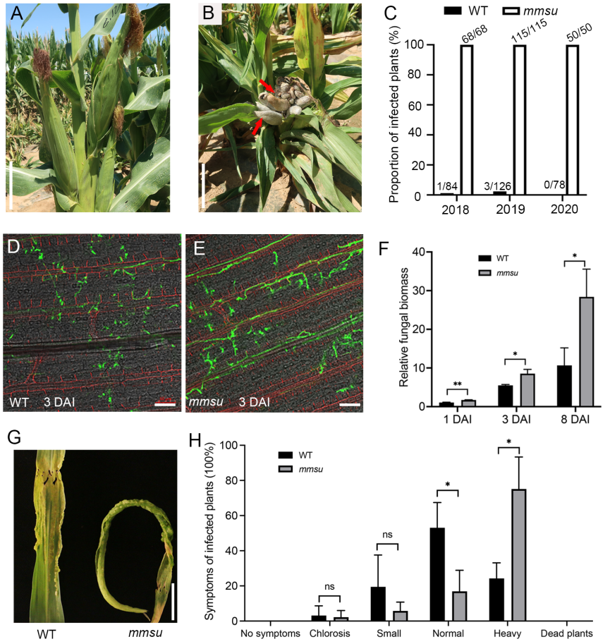 图1. 玉米mmsu突变体易感瘤黑粉病的表型鉴定