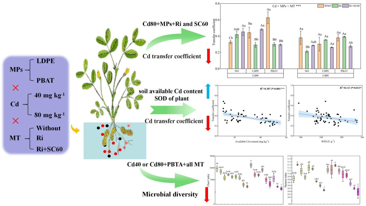 丛枝菌根真菌(AMF)可与大多数植物建立了共生关系。其菌丝具有较高的阳离子交换能力和金属吸附能力,增强了其对土壤中金属污染的耐受性。此外,内生细菌SC60具有对Cd的高耐受性。花生作为世界四大油料作物之一,花生产业受镉污染影响严重,但共生微生物如何影响Cd-MPs复合污染下花生生长及土壤微生物,现阶段尚不清楚。