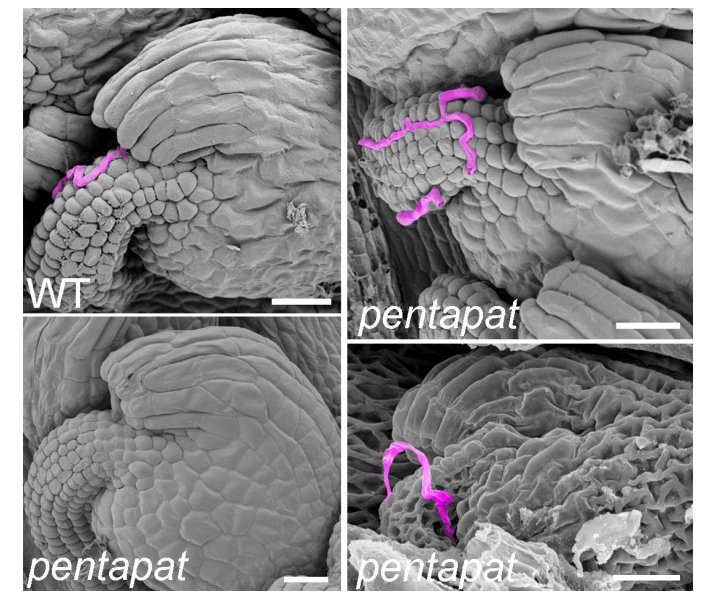 本研究报道了拟南芥棕榈酰基转移酶PAT1/2/3/4/8 (PENTAPA),催化受体激酶PRK1和LIP1的棕榈酰化,从而调控花粉管导向生长的分子机制。课题组利用T-DNA插入突变体杂交结合CRISPR/cas9基因编辑技术,获得了PAT1/2/3/4/8五个基因功能均丧失的突变体pentapat。突变体花粉管导向珠孔能力以及感受胚珠引导信号LURE的能力降低,育性下降。通过表型对比、互作验证、生化检测和遗传学分析,发现PENTAPAT催化PRK1和LIP1的棕榈酰化。棕榈酰化控制LIP1在质膜上的定位。相比而言,丧失棕榈酰化的PRK1正常定位于质膜,但丧失了与LIP1及鸟苷酸交换因子RopGEF的互作能力,从而干扰胞内信号传导。