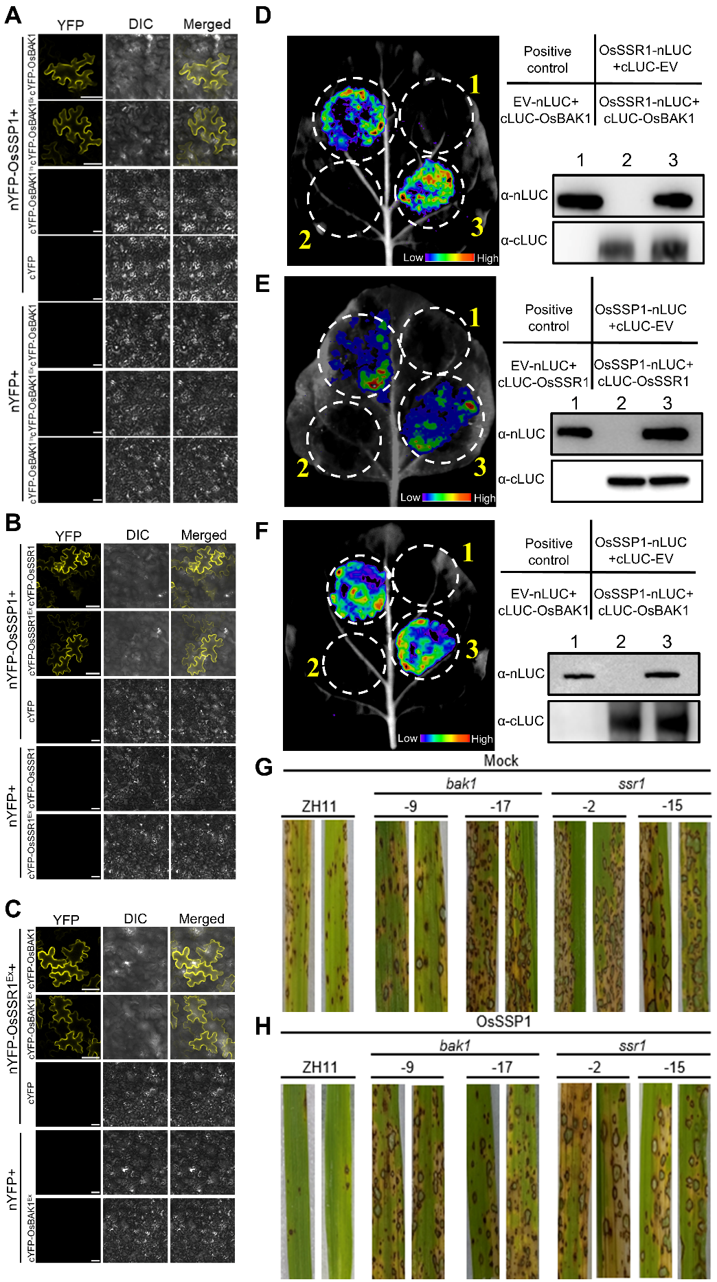 为了明确OsSSP1激发植物免疫的机理,研究团队筛选到与OsSSP1直接相互作用的两个膜蛋白:膜受体OsSSR1以及共受体OsBAK1。通过双分子荧光互补、荧光素酶互补成像以及Co-IP手段发现发现OsSSP1与膜受体OsSSR1、OsBAK1的互作均发生在它们的胞外区域,且OsSSR1与OsBAK1也通过胞外部分互作(图2A-2F)。进一步发现,OsSSR1及OsBAK1的基因编辑株系中,由OsSSP1诱发的植物免疫及水稻抗病性均受到显著影响(图2G-2H),说明OsSSP1所激发的植物免疫依赖于膜受体OsSSR1以及共受体OsBAK1。
