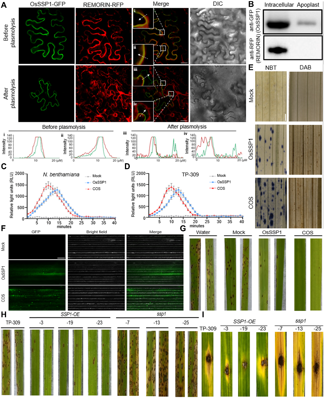 图1 水稻外泌蛋白OsSSP1可以被分泌到质外体空间内激发植物免疫并增强水稻抗病能力