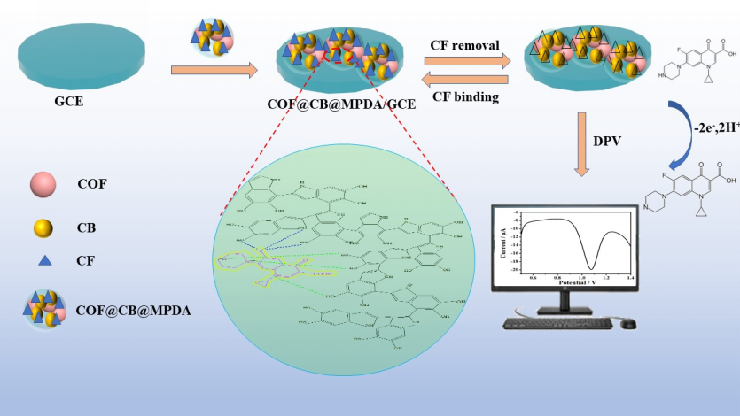 基于此,团队以COF、CB为基体,多巴胺为功能单体,结合分子印迹技术研究合成了一种比表面积大、导电性能优异且具有特异性识别作用的COF@CB@MPDA纳米材料用于环丙沙星的高灵敏电化学检测。基于COF@CB@MPDA构建的传感器对环丙沙星的检测具有较宽的线性范围、优异的选择性和较高的准确性。这项工作表明,COF@CB@MPDA在食品危害物的电化学检测中具有广阔的应用前景。