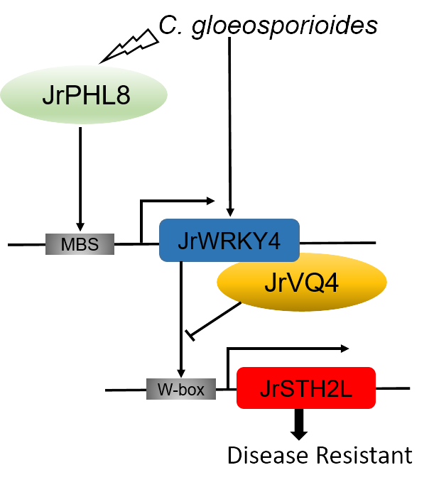 图1. 分子模块JrPHL8-JrWRKY4-JrSTH2L 调控核桃对炭疽病抗性