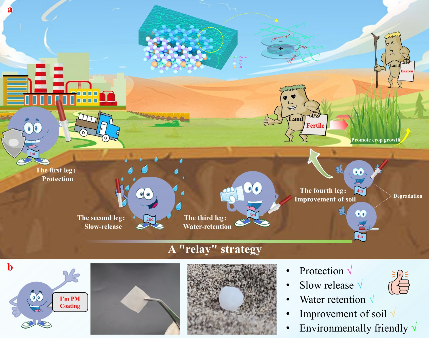 包膜肥料已被广泛用于提高贫瘠土地的肥力。然而,对于干旱和半干旱地区的沙质土壤来说,改善土壤结构和保水能力对促进作物生长与植物修复也至关重要。目前市售的大多数包膜肥料很少能满足这些要求,这限制了包膜肥料的应用范围。因此,本研究为荒漠化地区“量身定制”了果胶-蒙脱石多功能包膜,其结构特点是果胶和蒙脱石之间通过氢键、静电力和范德华力发生插层反应和纳米级缠结。值得注意的是,果胶-蒙脱石包膜展示了一种有效的“接力”作用模式。首先,该包膜可以作为保护尿素颗粒的“保护层”,提高了尿素82.12%的机械强度。其次,这种包膜延长了尿素的释放时间(从0.5小时延长至15天)。在尿素释放后,剩余的包膜不仅不会成为废弃物,还可以继续发挥土壤水分保持的作用。最后,随着包膜的降解,果胶分解物还改善了土壤性质。因此,这种包膜将有利于作物在干旱环境中的生长。此外,细胞毒性测试、生命周期评估和土壤生物降解实验表明,该包膜具有良好的使用与降解安全性,不会对人体、植物与土壤造成危害。综上所述,果胶-蒙脱石包膜的“接力”作用模式克服了传统包膜肥料的应用局限,为土壤退化地区开发专用包膜材料提供了一种可持续的策略。