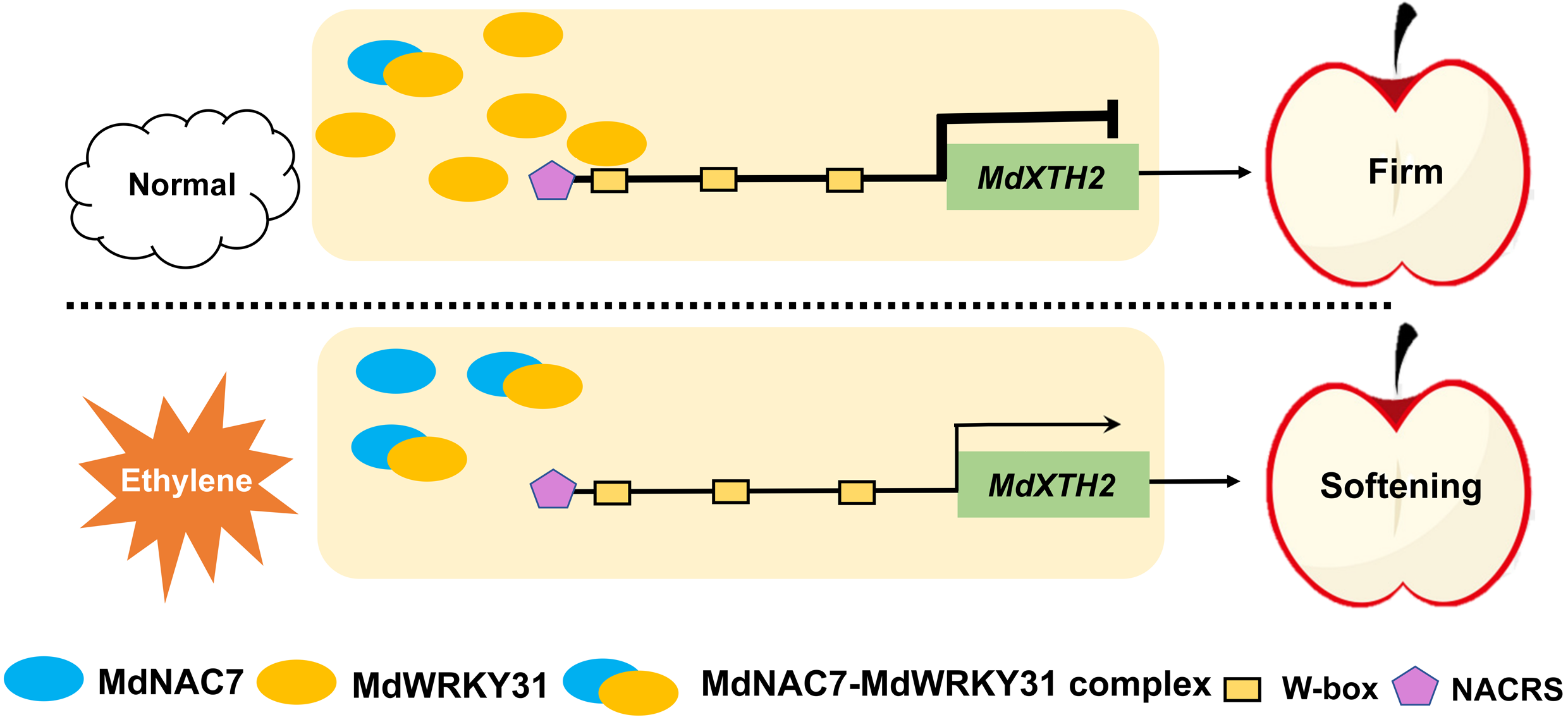 今日,山东农业大学园艺科学与工程学院苹果果实品质生物学与营养健康团队在Plant Biotechnology Journal期刊上发表了题为“MdWRKY31-MdNAC7 regulatory network: orchestrating fruit softening by modulating cell wall-modifying enzyme MdXTH2 in response to ethylene signalling”(https://doi.org/10.1111/pbi.14445)的研究论文,揭示了乙烯调控苹果果实软化的分子机制。