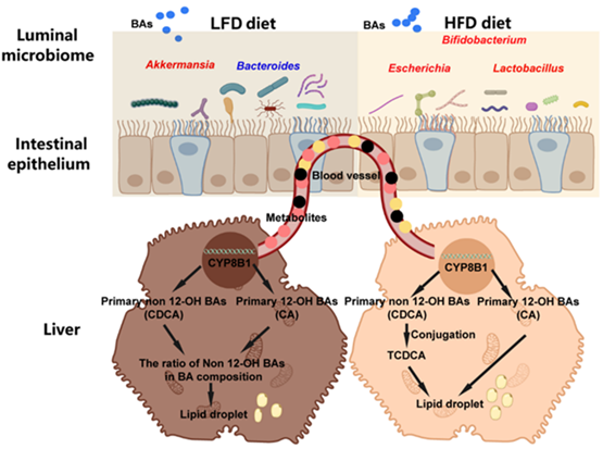 高脂日粮能够提高肉鸡的饲料转化率,但同时会导致脂肪在肝细胞中积累。本研究旨在阐明外源胆汁酸的作用及其在脂肪肝发生过程中与肠道微生物群的关联性。将1日龄肉鸡随机分为四组,分别饲喂低脂日粮(LFD,EE: 2.22%,4.79%)或高脂日粮(HFD,EE: 5.40%,7.65%),并在此基础上添加或不添加胆汁酸(BA,Bile acid)饲喂至42日龄,分为:LFD、LFD+BAs(60 mg/kg BAs)、HFD、HFD+BAs(60 mg/kg BAs)四个试验组。统计生产性能、分析肠道菌群、血浆脂肪代谢相关指标、肝脏脂肪代谢、胆汁酸合成相关基因表达和胆汁酸组成。结果显示,日粮中添加胆汁酸显著降低42日龄肉鸡血浆和肝脏组织甘油三酯水平,同时肝脏组织脂肪酸合酶(FAS)的表达水平显著下调,提示添加胆汁酸可减少肝脏脂肪沉积,这一效应与日粮类型无关。与LFD组相比,LFD+BAs组肝脏组织牛磺鹅脱氧胆酸(TCDCA)和鹅去氧胆酸(CDCA)的比例显著降低,同时牛磺猪去氧胆酸(THDCA)和牛磺熊去氧胆酸(TUDCA)的总比例显著升高。相对于HFD组,HFD+BAs组肝脏组织TCDCA的比例显著降低,牛磺胆酸(TCA)、CDCA和THDCA+TUDCA的比例显著升高,表明外源胆汁酸能够改变肉鸡肝脏组织内源胆汁酸组成,这一作用受日粮脂肪水平的影响。CYP8B1是胆酸合成过程中的关键酶,它决定了Non 12-OH BAs与12-OH BAs的比例。相较于LFD组,LFD+BAs组肉鸡肝脏组织Non 12-OH/12-OH的数值显著升高,且CYP8B1表达量显著降低。而与HFD组相比,HFD+BAs组肉鸡肝脏组织Non 12-OH/12-OH的数值显著降低,CYP8B1表达量显著升高。Non 12-OH BAs与12-OH BAs比例的变化可能受到肠道菌群的影响。通过16S rRNA测序分析。本研究发现相较于LFD组,LFD+BAs组肉鸡肠道中Akkermansia的丰度显著升高。而与HFD组相比,HFD+BAs组肉鸡肠道Alistipes的丰度升高,Akkermansia的丰度降低。这表明外源胆汁酸添加到不同脂肪水平的日粮中,对肉鸡肠道菌群和肝脏组织胆汁酸合成的影响不一致。对肉鸡肠道菌群和肝脏组织胆汁酸进行关联分析,结果显示,在低脂日粮饲喂的肉鸡中,Bacteroides的丰度与CA和CDCA的含量呈显著负相关。而在高脂日粮饲喂的肉鸡中,Bacteroides的丰度与TCDCA的含量呈显著正相关,Bifidobacterium的丰度与TCDCA含量呈显著负相关。Escherichia和Lactobacillus分别于CDCA和CA的丰度呈显著正相关。这些结果表明,虽然胆汁酸在低脂日粮和高脂日粮中均能减少肉鸡肝脏脂肪沉积,但其作用机制不同。在低脂日粮中,胆汁酸可能通过调控Akkermansia和Bacteroides的丰度,改变Non 12-OH BAs的比例,从而减少肝脏脂肪沉积;而在高脂日粮中,胆汁酸则可能通过Bacteroides、Bifidobacterium、Escherichia和Lactobacillus的调控作用,改变TCDCA、CDCA和CA的含量,进而降低肉鸡肝脏脂肪沉积。综上所述,补充胆汁酸能够改善肉鸡肝脏脂肪代谢,而这种作用与肠道微生物群和肝脏胆汁酸谱的改变密切相关。