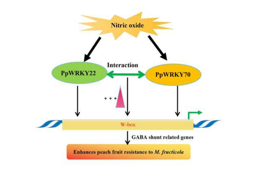 桃果实含有丰富的膳食纤维、蛋白质和维生素,深受广大消费者的喜爱。桃果实收获于高温多雨季节,采后易受病原菌侵染,其中由链核盘菌引起的褐腐病是导致桃果实采后腐烂的主要原因之一,严重影响桃果实品质及商品价值。我们之前的研究表明,一氧化氮(Nitric oxide, NO)处理通过激活γ-氨基丁酸(γ-aminobutyrate, GABA)分支显著抑制桃果实褐腐病。其中转录因子在调节GABA分支相关基因的转录中发挥着关键作用。然而在桃果实防御真菌病原体感染的过程中,转录因子介导GABA分流的转录调控仍在很大程度上未知。