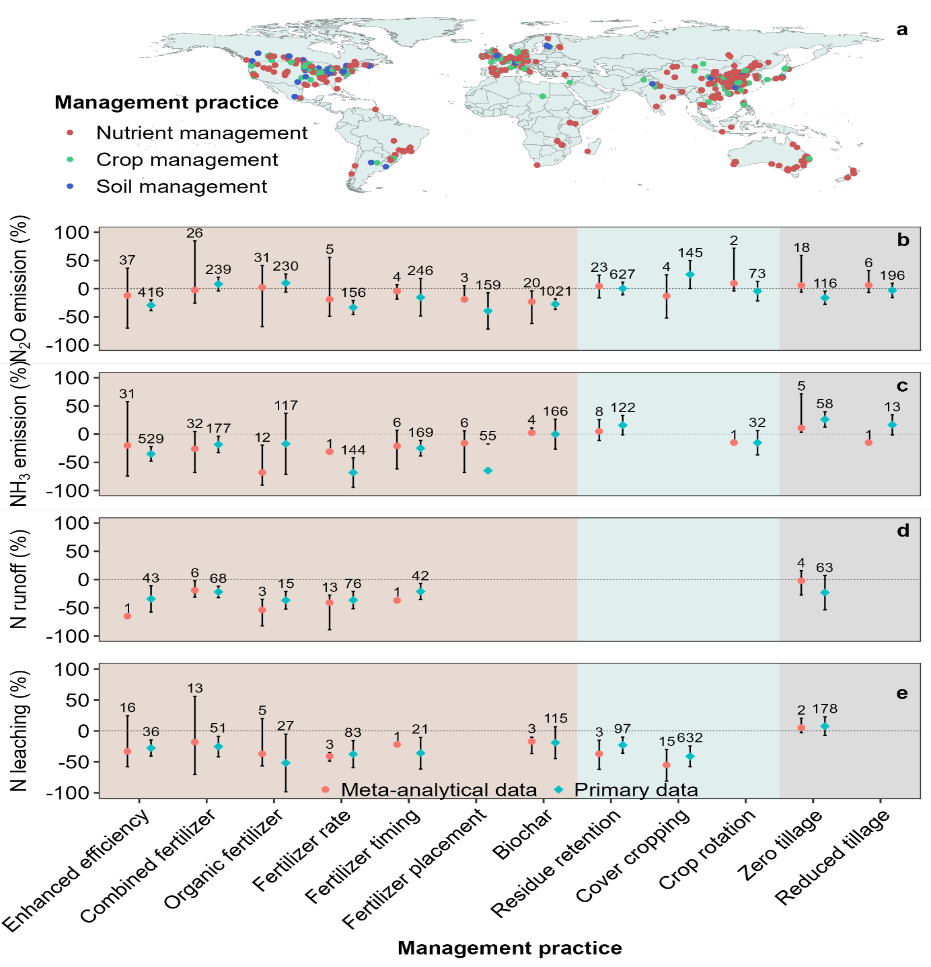 该研究评估了优化管理措施降低全球农田氮损失的潜力,在考虑当地气候、土壤条件和传统管理措施的背景下,可使全球范围内N2O排放、NH3挥发、氮径流和氮淋洗平均减少17-31%,为氮素可持续管理提供了理论支撑和科学证据。