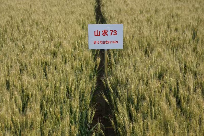 山农73号,审定编号:鲁审麦20240009。由孔令让教授团队选育,冬性,幼苗半匍匐,株型半紧凑,叶色深绿,旗叶小、上举,熟相好。生育期与济麦22相当,株高81.7厘米,抗倒性较好,亩最大分蘖92.9万,亩有效穗41.3万,分成穗率45.9%,穗纺锤形,穗粒数39.5粒,千粒重44.9克,容重803.3克/升,长芒、白壳,白粒、籽粒硬质。越冬抗寒性好。叶锈病免疫,中感条锈病、白粉病和赤霉病,高感纹枯病。籽粒蛋白质含量12.34-12.70%,湿面筋含量27.4-32.3%,沉淀值27-29m1,吸水率60.8-64.7m1/100g,稳定时间5.1-5.6min,面粉白度73.8-74.9。2023-2024年高产组生产试验,平均亩产634.2公斤,比对照济麦22增产4.9%。
