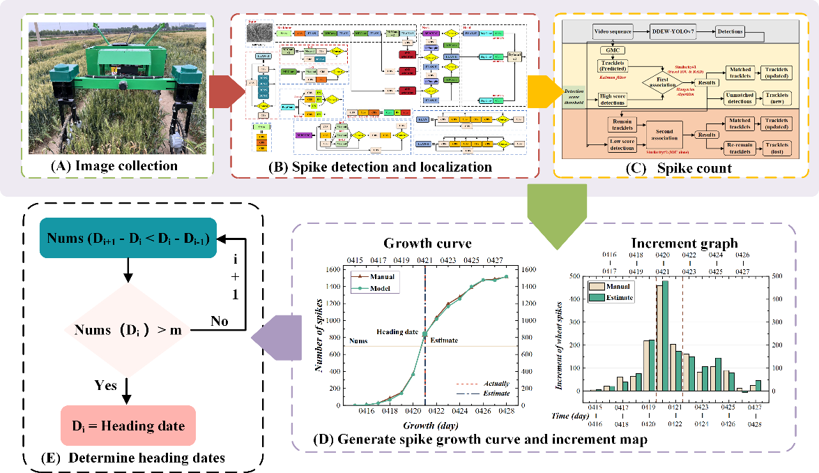 2024年12月,Expert systems with applications(中科院一区TOP期刊,影响因子7.5)在线发表了山东农业大学刘平教授团队题为Real-time Monitor Heading Dates of Wheat Accessions for Breeding In-field Based on DDEW-YOLOv7 Model and BotSort Algorithm的研究论文。