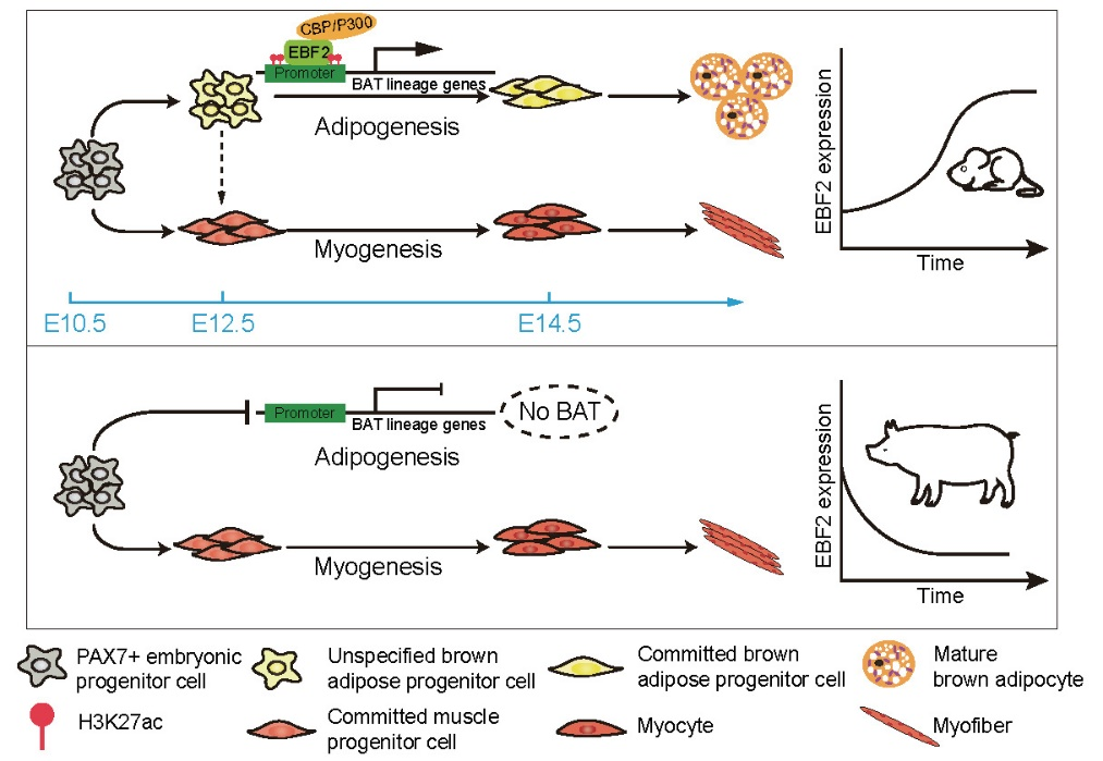 本研究鉴定了中胚层前体细胞分化为棕色脂肪前体细胞和肌肉前体细胞的命运决定过程中的染色质动态图谱,发现转录因子EBF2通过招募组蛋白乙酰转移酶,促进棕色脂肪谱系基因的染色质乙酰化水平,诱导棕色脂肪的形成。在猪的早期胚胎发育过程中,由于EBF2的表达缺失,导致其无法分化为棕色脂肪细胞。该研究为理解猪与其他动物在棕色脂肪组织发育的差异提供了新的线索,并为脂肪代谢疾病的治疗提供了依据。