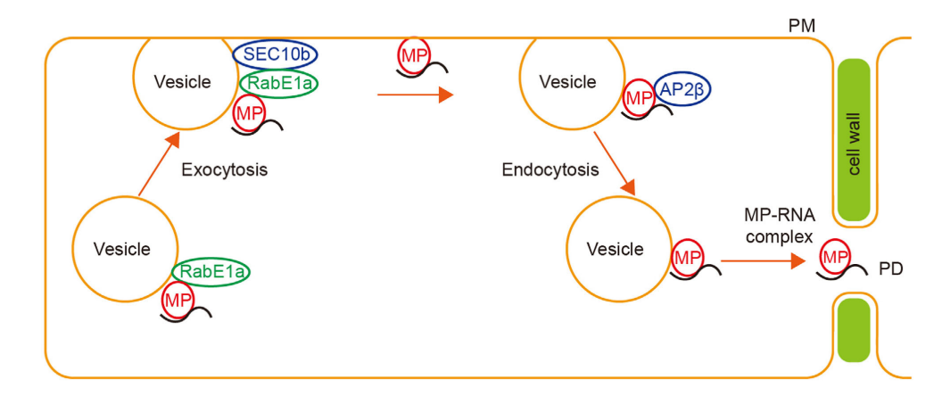 总之,研究者提出了一个模型,其中MP劫持分泌途径和内吞途径以参与ToBRFV的胞内运动(图5)。ToBRFV MP与RabE1a相互作用,并劫持由RabE1a和SEC10共同调控的分泌途径到达质膜。到达质膜后,MP与AP2β相互作用,劫持内吞途径到达胞间连丝,然后以核糖核蛋白复合体的形式通过胞间连丝进入邻近细胞。研究结果全面展示了MP的胞内运输过程,并为培育抗ToBRFV及相关烟草花叶病毒属病毒的番茄种质资源提供了新的靶点。