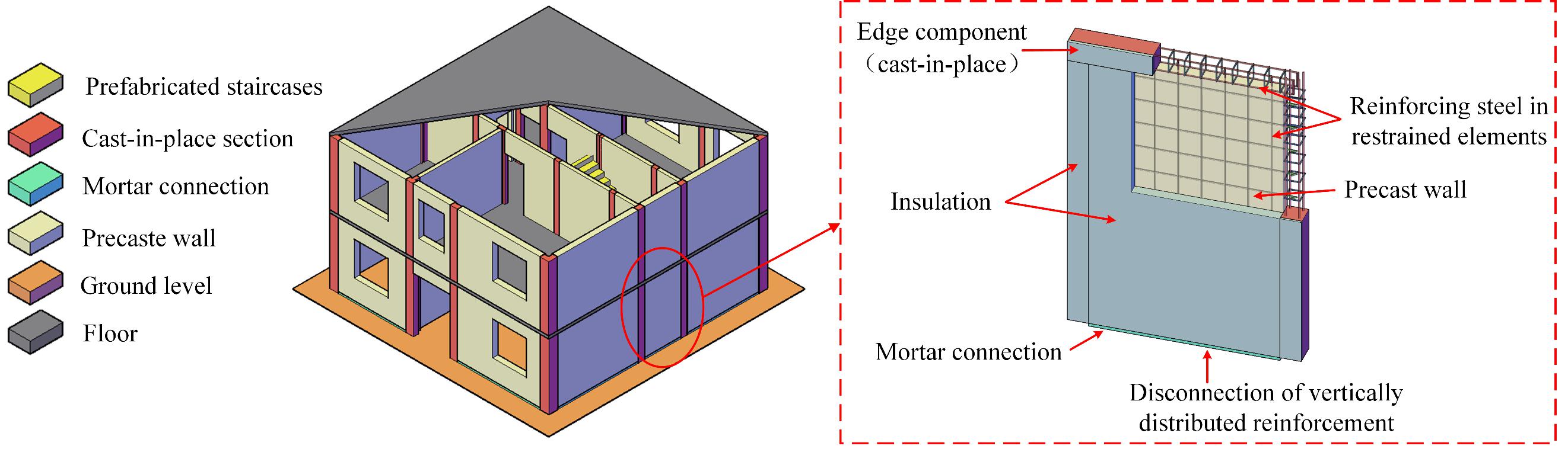 农村传统自建房多为低层砌体结构,大多无专业设计、无专业施工,抗震性能通常较差,缺少节能保温措施,且以现场施工建造为主,不仅工期长且劳动强度特别大。为此,本文提出了一种多功能一体化快装低层建筑体系(图1),由集承重和保温功能于一体的钢筋混凝土预制墙板装配建造而成,可以实现村镇建筑的抗震、节能、快速建造,综合性能和效益十分显著。