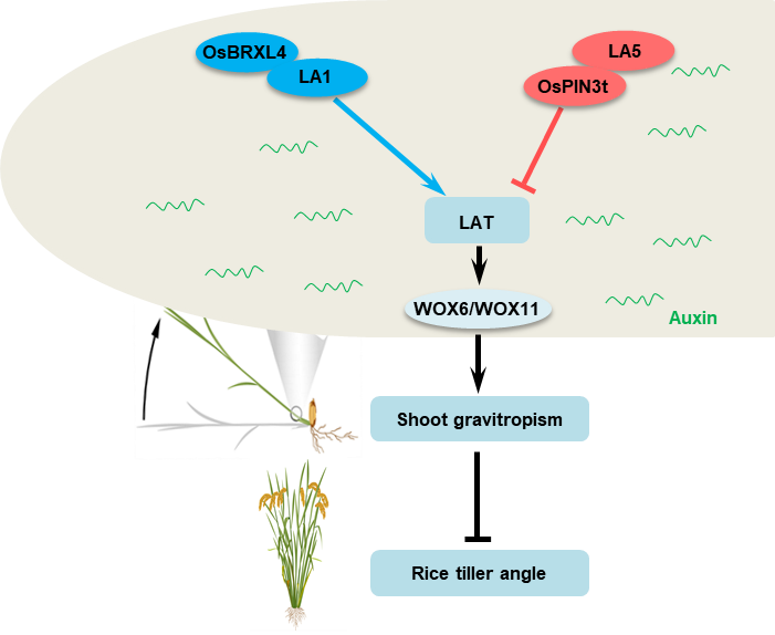 图1.LA5调控水稻侧向生长素运输和分蘖角度新途径的工作模型