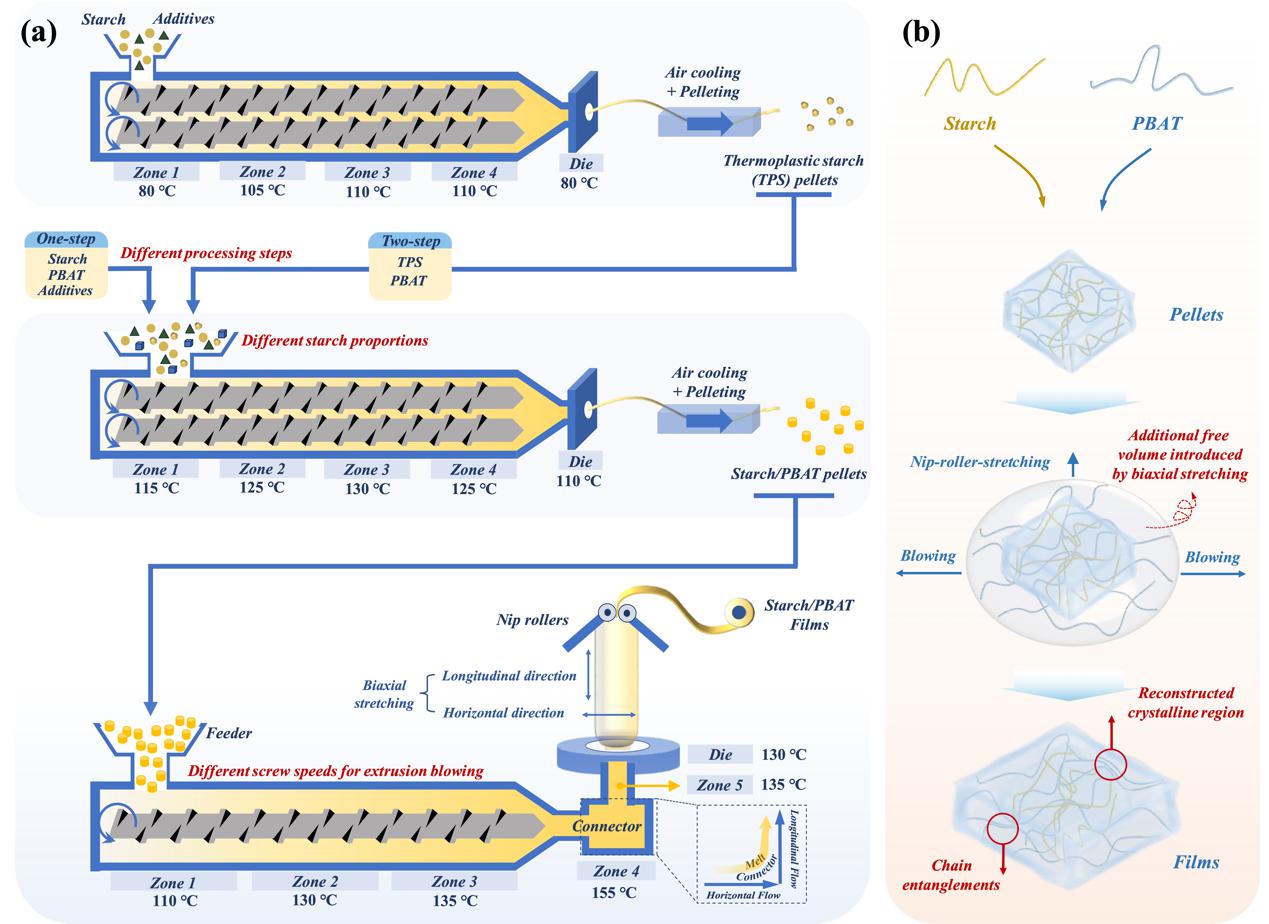 淀粉/聚对苯二甲酸-己二酸丁二醇酯(PBAT)复合材料是一种有前途的可生物降解材料,可用作食品、农业等多行业的可持续膜材。然而,双相体系的成膜过程较为复杂,难以系统地解析淀粉与PBAT在混合加工过程中所经历的分子结构、结晶结构及相结构转变。此外,大多数研究受限于样本数量较少,缺乏在加工参数与薄膜性能之间建立稳健的关联、预测模型。