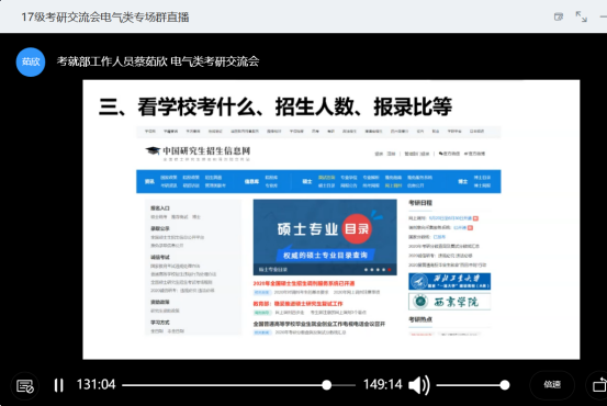为发扬学院学风建设传帮带优良传统,引领2017级本科生考研学生坚定信心、明确行动、消除迷茫,学院特此举办“‘研’阵以待 奋力前行”线上考研经验分享会,此次活动由学院团委主办、院学生会考研就业服务部承办。此次交流分为研究生推免专场、机械类考研专场和电气类考研专场,邀请到了部分成功上岸的2020届学生为大家解疑答惑。