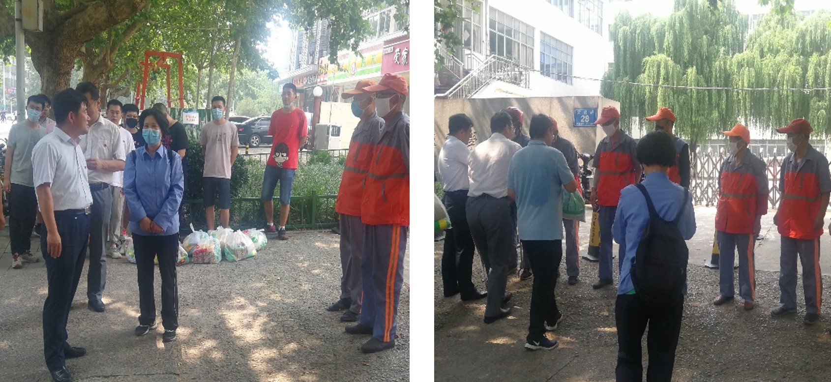 7月6日下午,学院党委书记刘希山等领导老师带领研究生支部,在德馨公寓前为文化路农大段辛勤工作的环卫工人师傅送去洗衣粉、透明皂、毛巾等清洁用品,并与路段卫生负责人黄学红及环卫工人亲切交流,感谢大家长期以来创造的干净、整洁、舒适的工作生活环境,嘱咐大家在炎热夏季做好工作同时保重身体,注意防暑。
