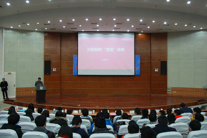 表彰结束后,百度公司的商务搜索用户体验经理方传兵、高级产品经理胡海川为信息学子作了“互联网的变现思考”及“互联网创业的融资与产品设计”的报告。同时,学院领导、企业代表、创新创业导师以及师生代表进行了交流座谈。