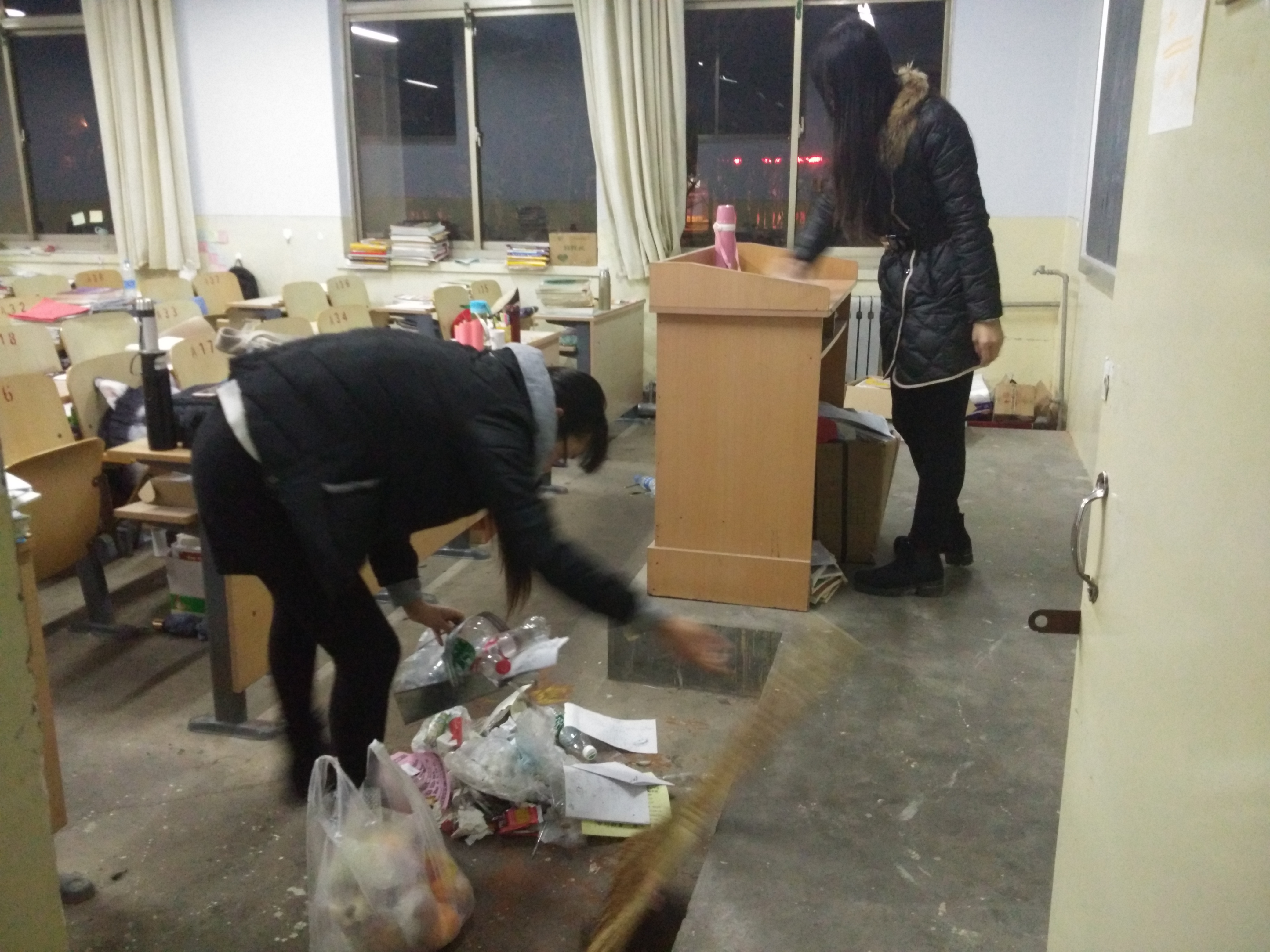 前期,学院学生党建委员会、各学生党支部进行动员宣传及责任区分工,并成立监督工作小组;要求全体学生党员以小组为单位,主要负责本部5S教学楼103、105、107、109、111、114考研自修室,对所在责任区的地面、黑板、桌椅等地方进行全方面的清扫,以营造卫生、文明、和谐的校园环境。