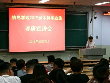 6月20日晚,信息学院在教学楼5N-102成功举办2019届本科毕业生考研宣讲会。研究生处副处长石磊、信息学院副院长柳平增等出席会议,学院2015级本科生参加了此次活动。