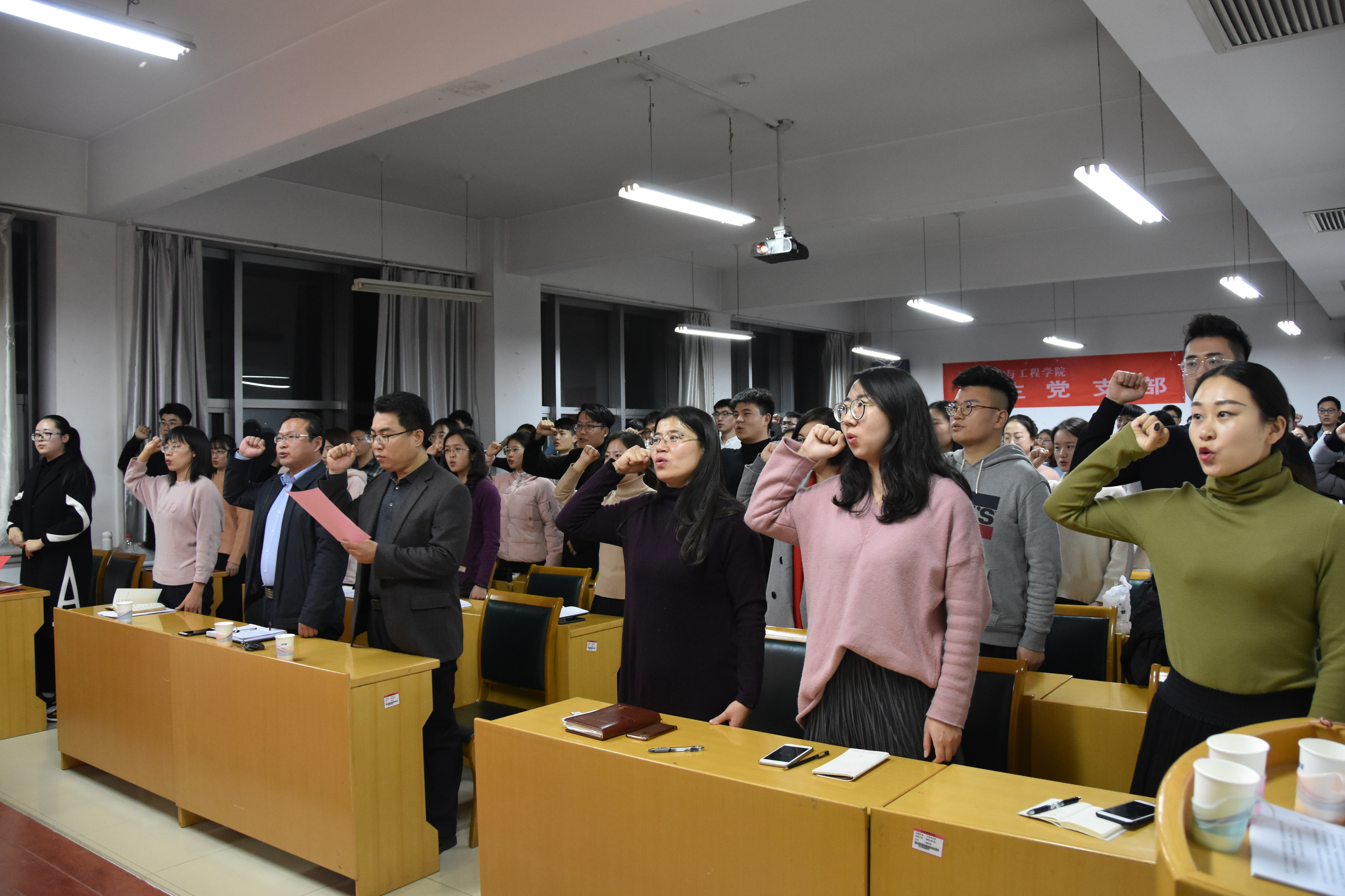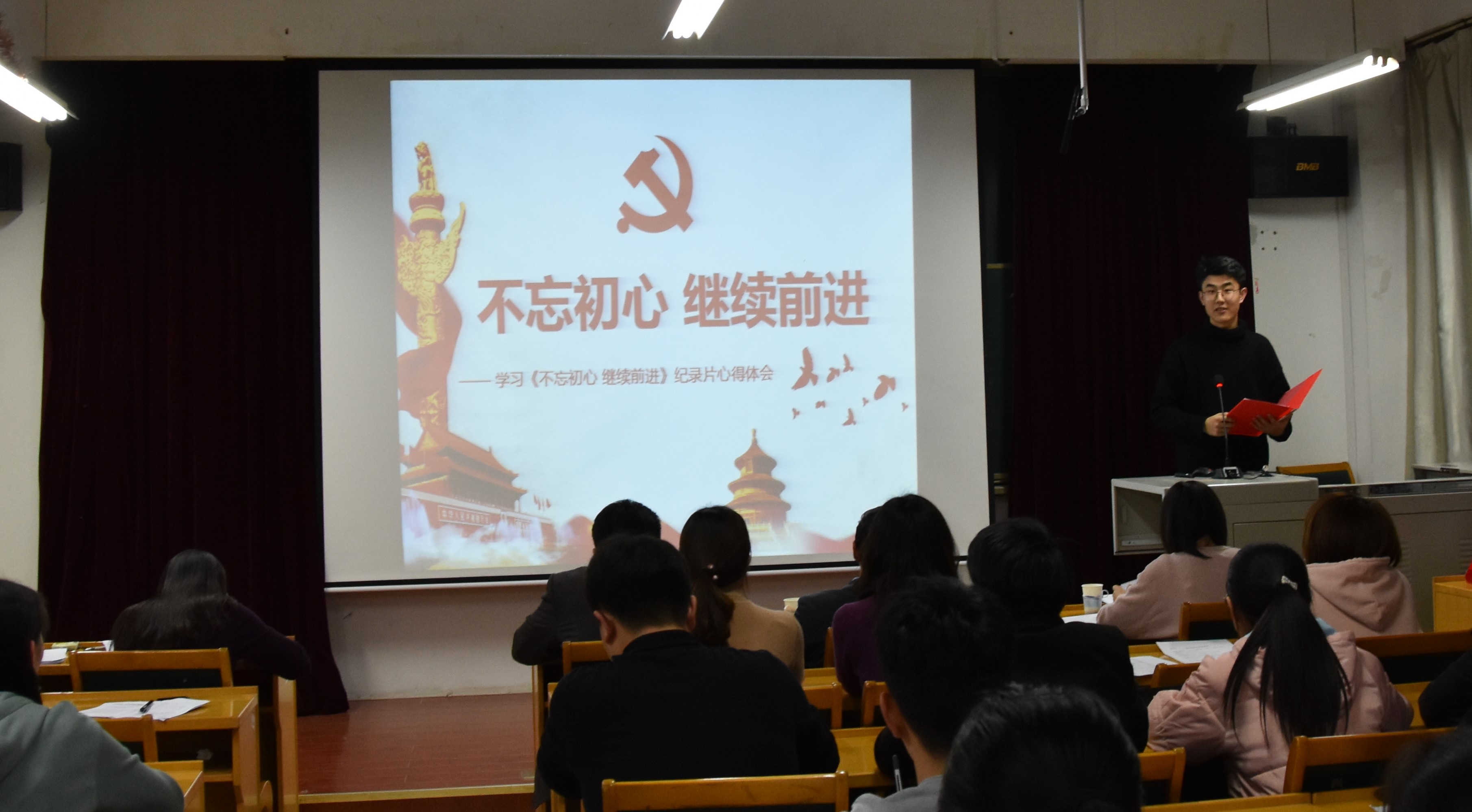 11月30日晚,信息学院于北校区文理大楼804成功举办“青春党建微讲堂”主题党日活动。学院党委书记李广松、副书记李华、全体辅导员、党员及部分入党积极分子参加了此次活动。本次活动以“学习习近平总书记系列讲话精神,争做新时代合格共产党员”为主题,四名学生党员从先模精神、榜样力量、做诚实学问、做正直人等方面进行阐述,与同学们分享了自己的认识与心得体会,并号召同学们不忘初心,牢记使命,建功新时代,展示新作为,做新时代的接班人。会前,全体新发展党员进行入党宣誓、老党员重温入党誓词。
