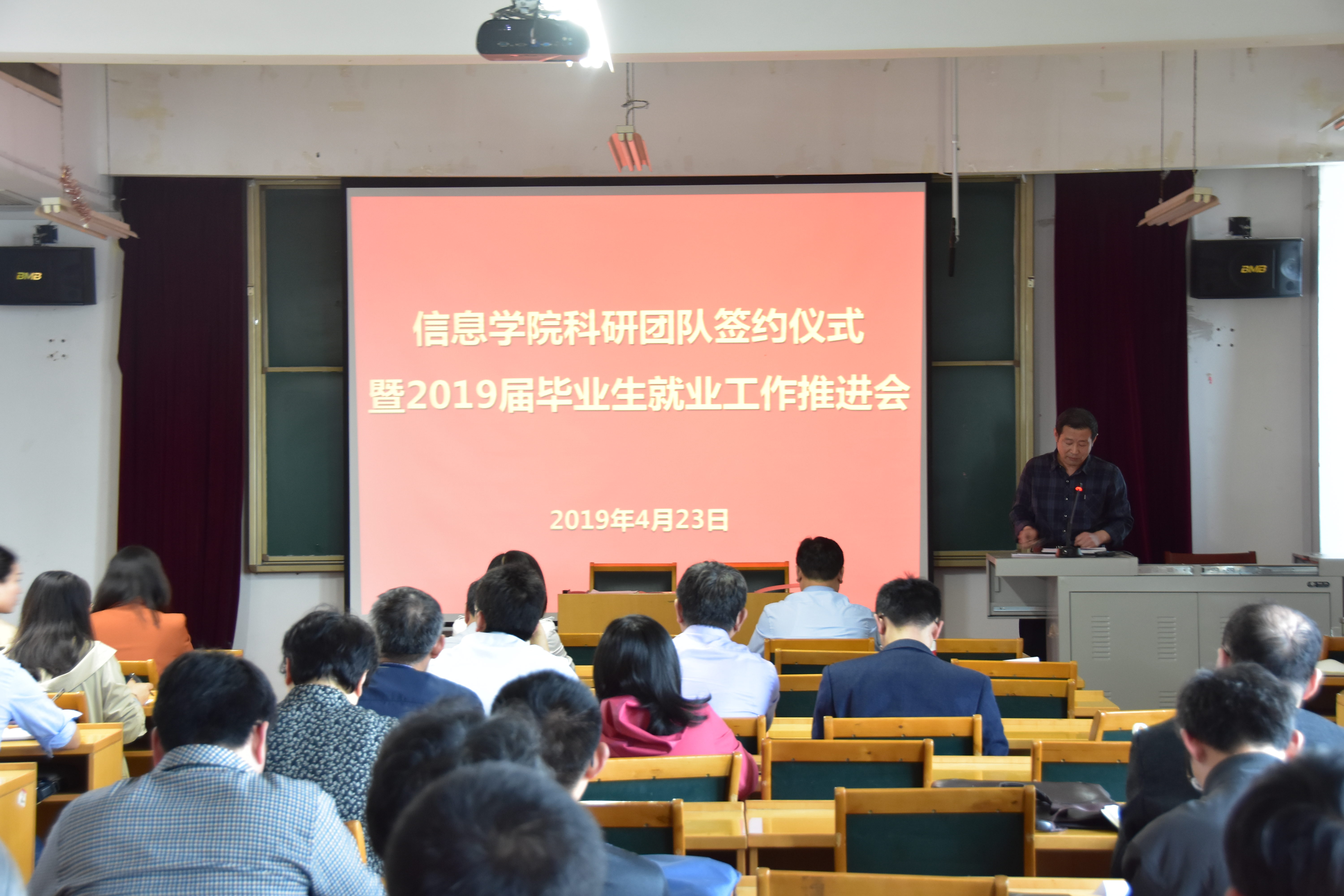 签约仪式前,院长李西灿发表讲话。李西灿指出“重组科研团队是信息学院2019年的工作重点之一。目的是为了增强合作意识,加强团队间交流。今年科研团队由去年的13支增长到20支,并且涵盖了90名学院科研骨干教师。”科研团队签约仪式由李西灿主持,各科研团队负责人依次上台签约,现场反响热烈。