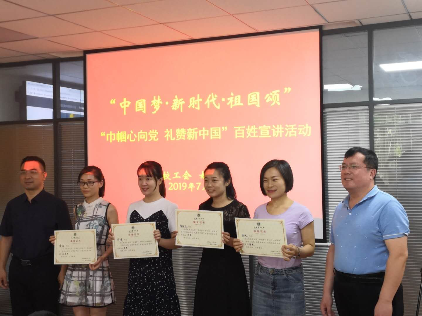 7月4日下午,学校工会举办“巾帼心向党 礼赞新中国”百姓宣讲活动,从学校各部门、单位工会推荐、上报百姓宣讲员中遴选出8位,参加宣讲活动。信息学院选送的张凤老师、周倩老师位列其中,经过8位选手精彩宣讲,最后,张凤老师、周倩老师荣获三等奖,展现信息学院女教职工“巾帼心向党 礼赞新中国”良好精神风采,为学院赢得荣誉。