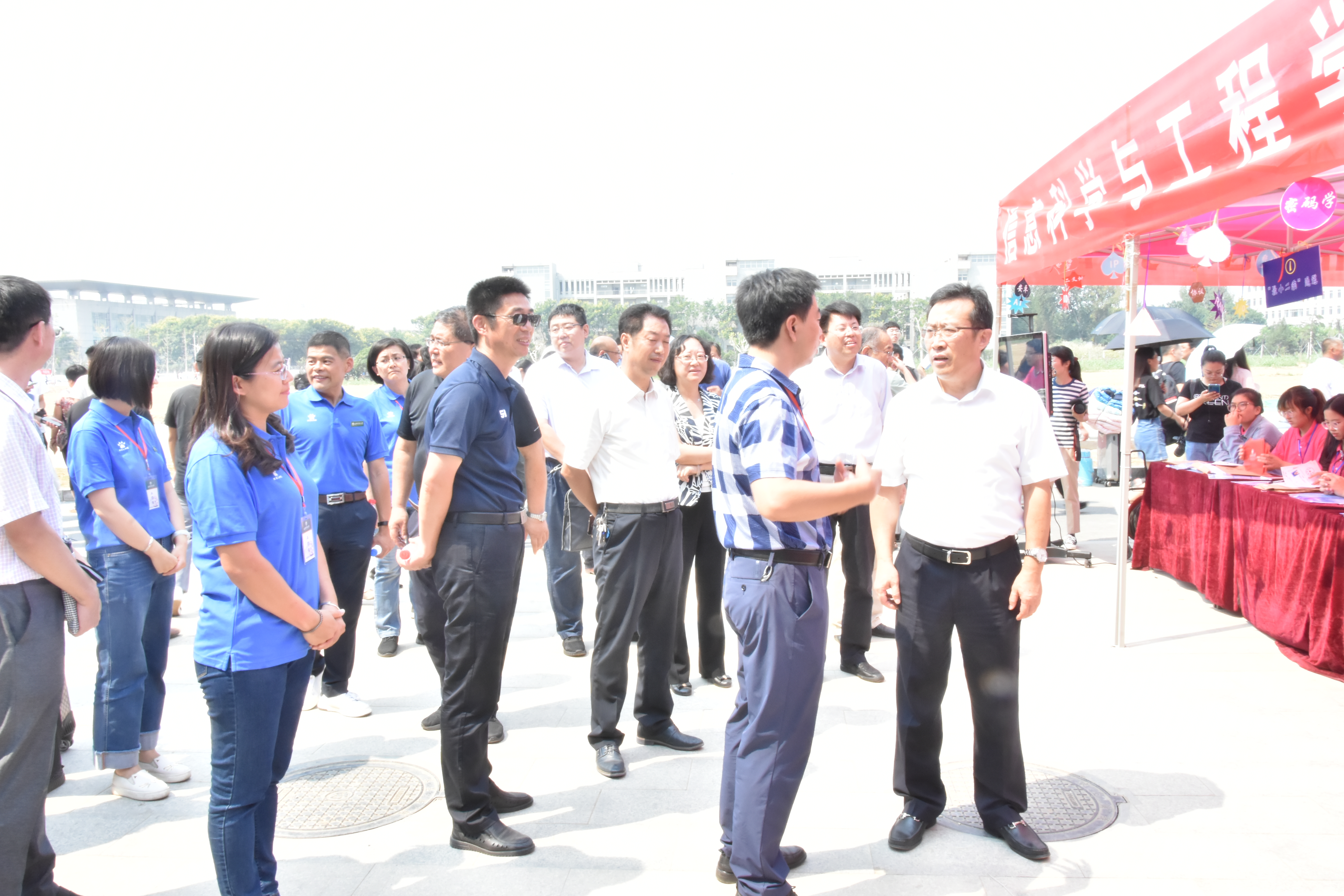 迎新现场整体采用信息蓝的基本色调,以“最小二乘”、“香农定理”、“丢番图”、“深度学习”、“贝叶斯网络”命名的5个报道通道,让新生第一时间感受大学专业的魅力;细节处增添了计算机、数学、大数据、测绘等专业词汇构成的垂帘,如“ROM”、“方程式”、“FTP”、“比特序列”等,帮助新生在趣味中接受专业教育。同时,学院在迎新现场放置了拍照签名设备,新生及家长可以在报到的第一时间,将喜悦的笑脸和热切的憧憬一起定格在幸福的瞬间,在旁边签上自己的入学“初心”,将签名留给四年后的自己。拍照结束后,学生通过扫描大学生启航科技开发公司设置的小程序,可以将照片保存到自己的手机,提醒自己时刻不忘入学初心,牢记大学使命。此外,报道出口处设置的考研就业光荣榜等宣传展板,体现了学院优良的学风,引得学生和家长的驻足。