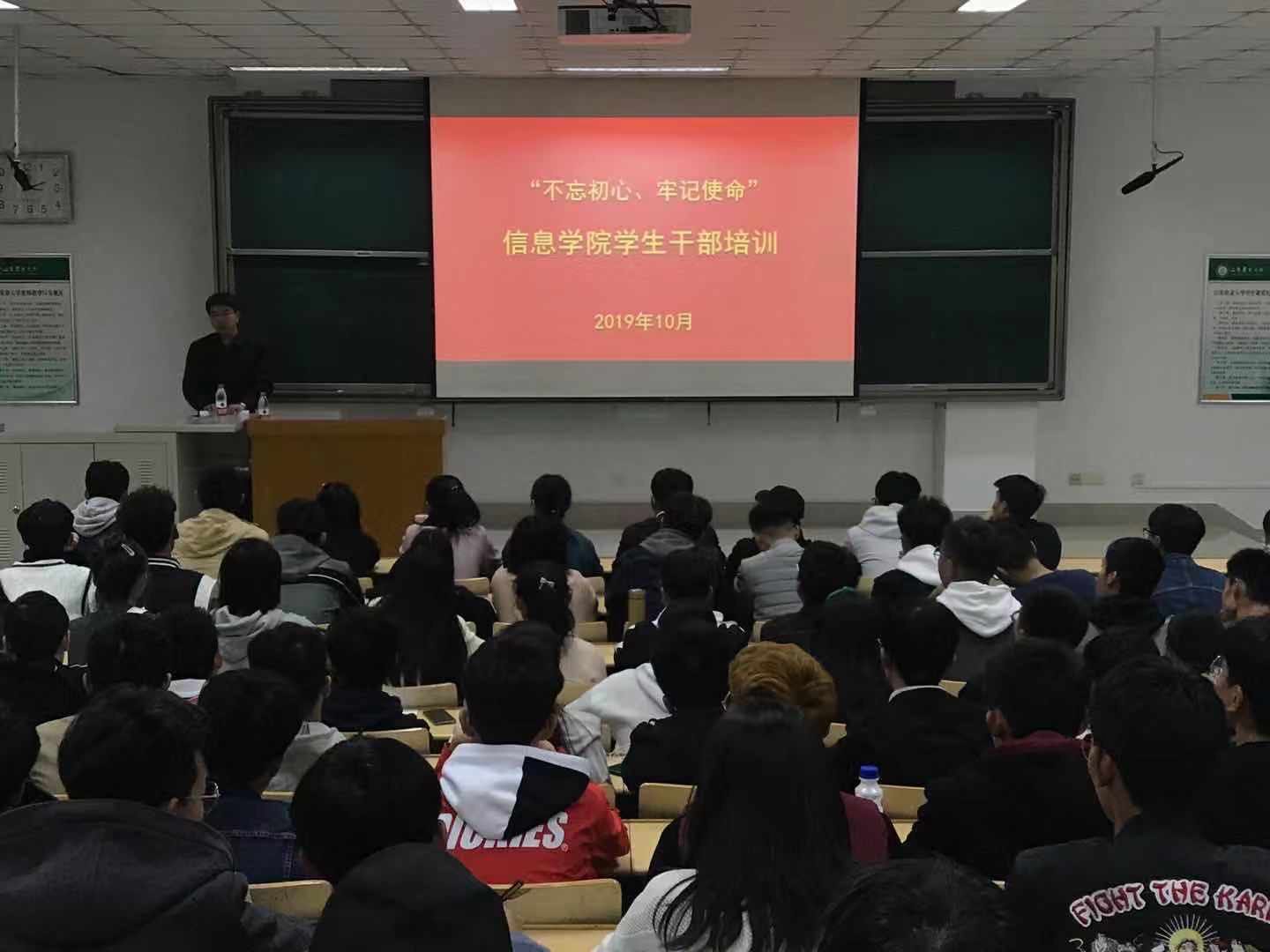 为增强学生干部自我教育、自我管理、自我服务、自我监督的能力,10月27日下午,信息学院于南校区教学楼N102召开学生干部培训会。本次会议由团委刘立敏老师主持,学院党委副书记徐宏志、团委副书记刘昆以及2019级全体班级学生干部参加。