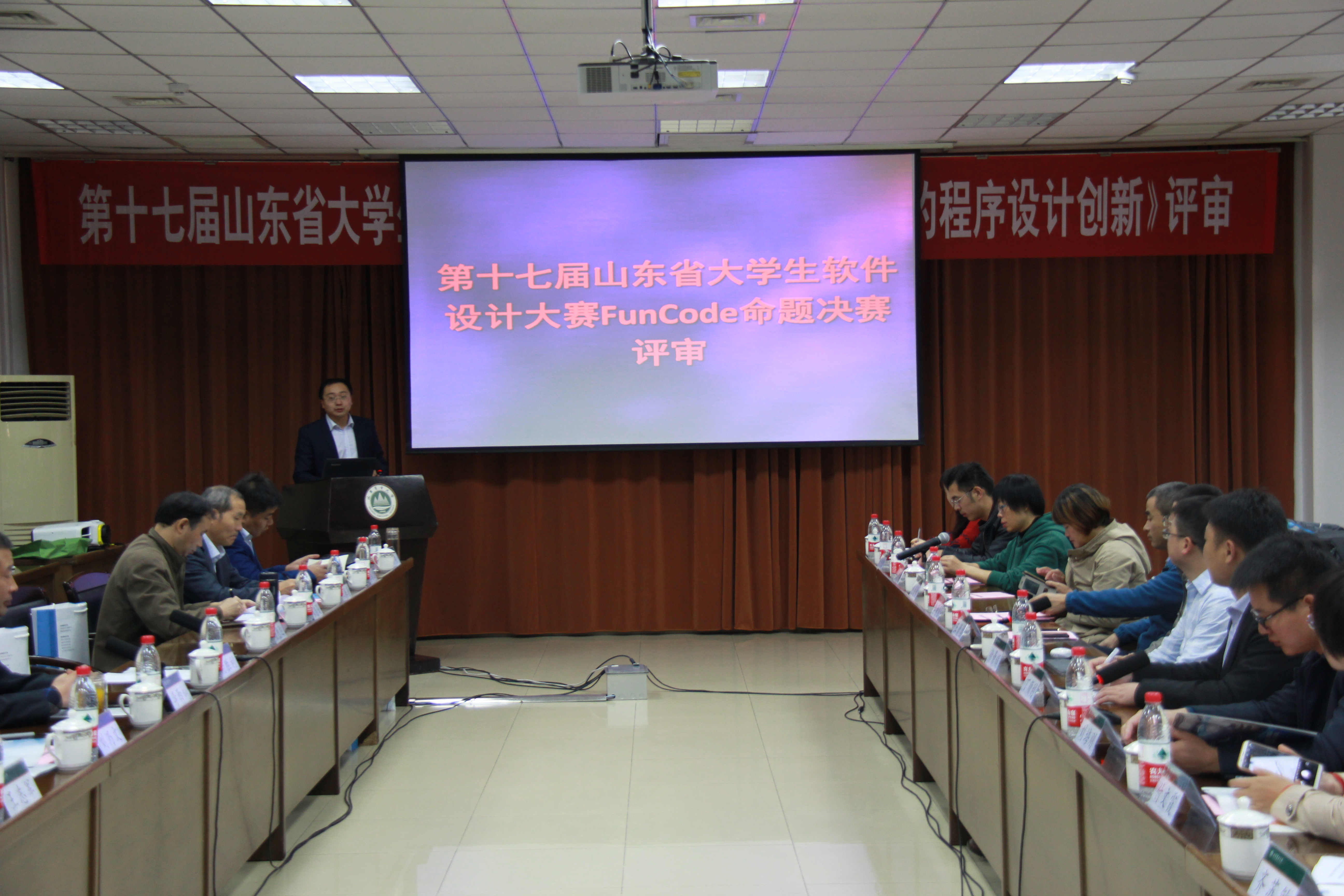 10月26日,第十七届山东省大学生软件设计大赛《基于FunCode平台的程序设计创新》决赛评审暨实践教学改革研讨会在文理大楼报告厅第二会议室顺利举行。学校教务处处长谢胜利,信息科学与工程学院院长李西灿出席会议。会议由信息学院计算机系主任王鲁主持。来自全省二十余所兄弟学校的大赛评委、指导教师、参赛选手等近百人参加会议。会议分为两个部分,上午进行第十七届山东省大学生软件设计大赛《基于FunCode平台的程序设计创新》决赛评审,下午进行以竞赛为驱动的创新人才培养的计算机实践教学改革研讨会。