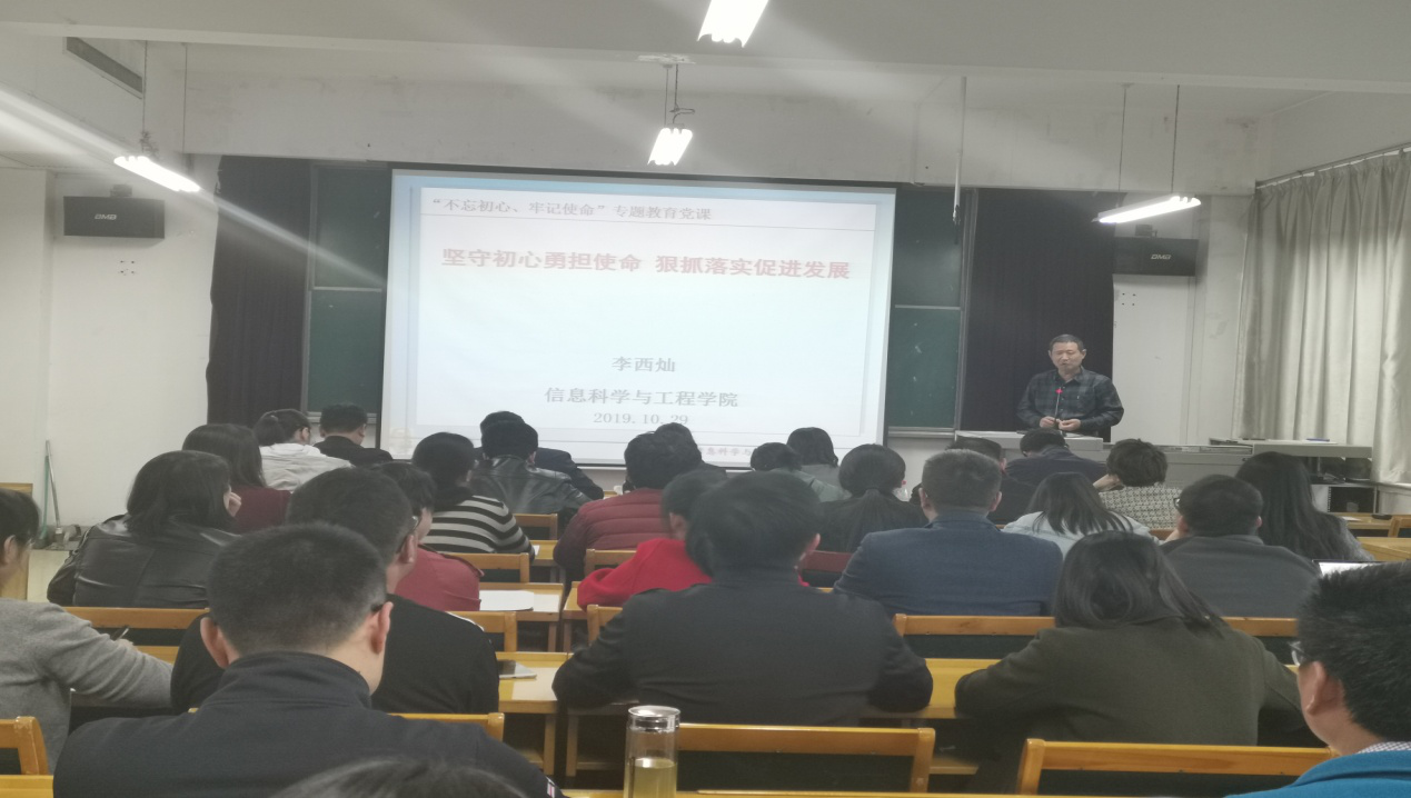 10月29日下午,按照学校“不忘初心、牢记使命”专题党课安排,学院党委副书记、院长李西灿在文理大楼804,以“坚守初心勇担使命 狠抓落实促进发展”为题,为学院班子成员、中层干部、辅导员讲授专题党课。学校党委巡回指导组成员李萍、李明娟出席党课。学院领导班子成员,各支部书记、委员,各系(中心)主任、副主任,全体辅导员,共计50余人聆听党课。