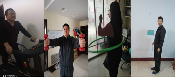 图1 信息学院教工运用各种体育器械开展“居家”健身活动